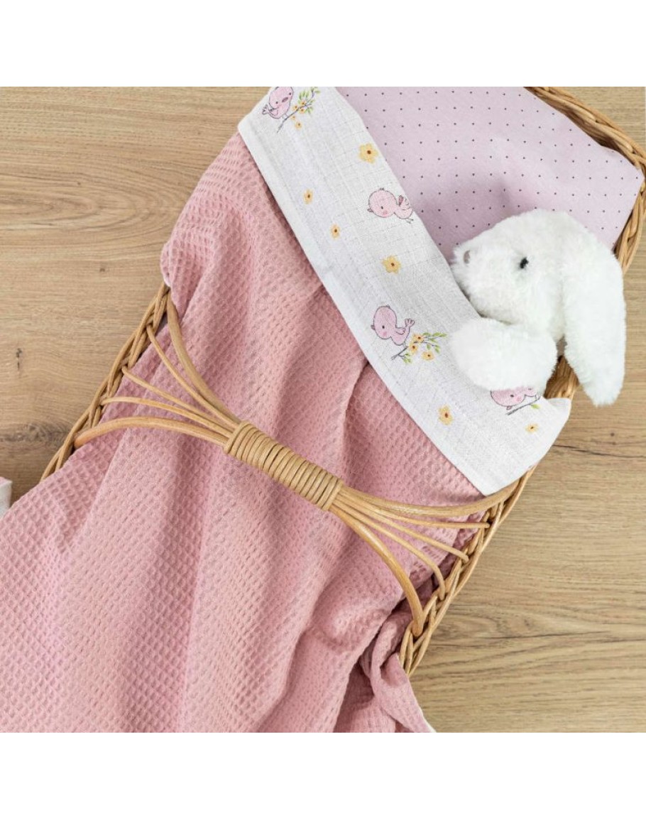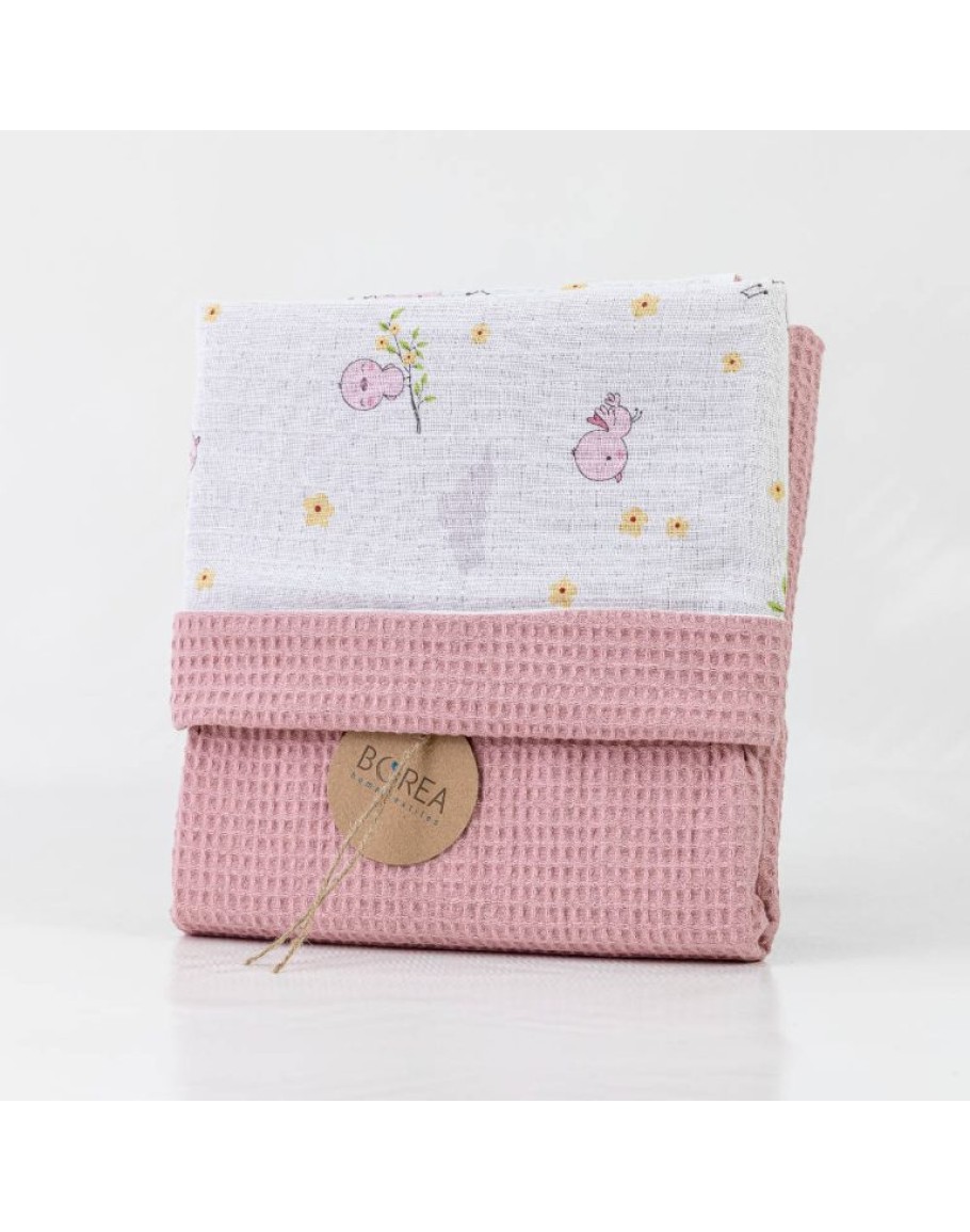 Κουβέρτα Αγκαλιάς, Birdie, Little, Borea, Ροζ, από ύφασμα πικέ waffle, μονόχρωμο, και ύφασμα muslin, με εμπριμέ παιδικό σχέδιο. Διαστάσεις: 80X110εκ.