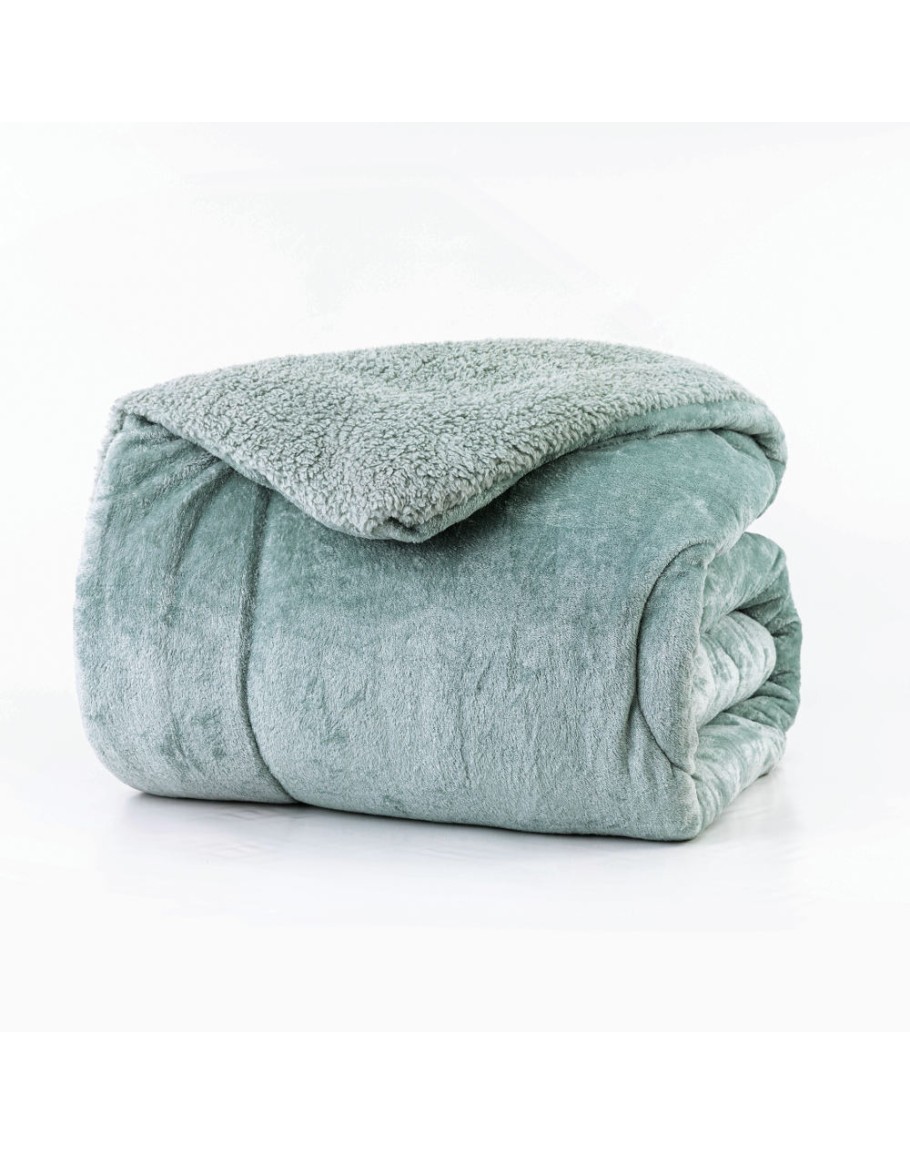 Χουχουλιάρικο κουβερτοπάπλωμα υπέρδιπλο, Cozy μέντα, Borea, με γούνα sherpa (προβατάκι) από τη μια μεριά, κουβέρτα flannel fleece από την άλλη και βάτα 300γρ/τμ ανάμεσα. Εξαιρετικά ζεστό κι απαλό. Διάσταση: 220Χ240εκ