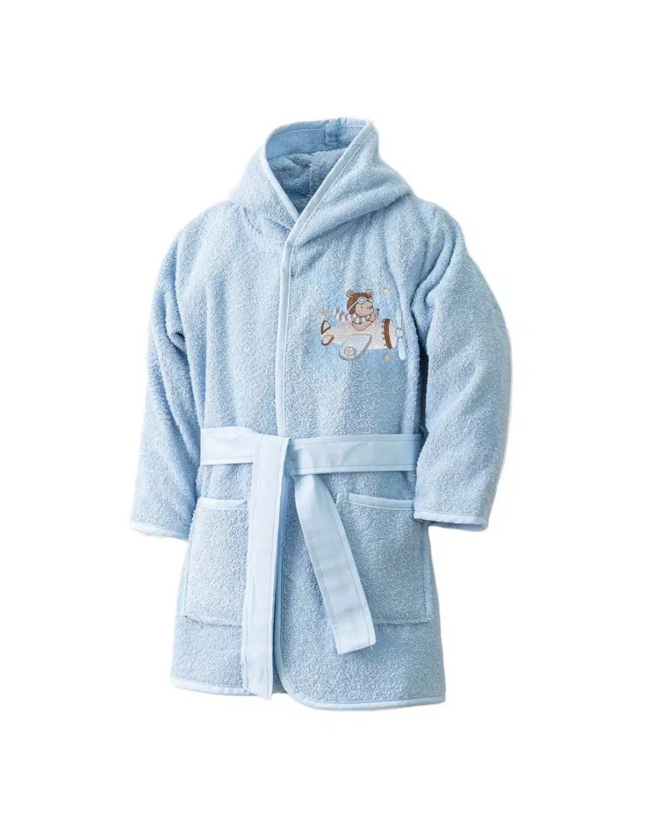 Μπουρνούζι Βρεφικό με κουκούλα, Pilot, Borea, κέντημα και σιέλ ρέλι περιμετρικά, στις τσέπες, τη ζώνη και τα μανίκια, από ύφασμα φροτέ πενιέ, 100% βαμβακερό, μονόχρωμο, σιέλ, σχέδιο πιλότος.