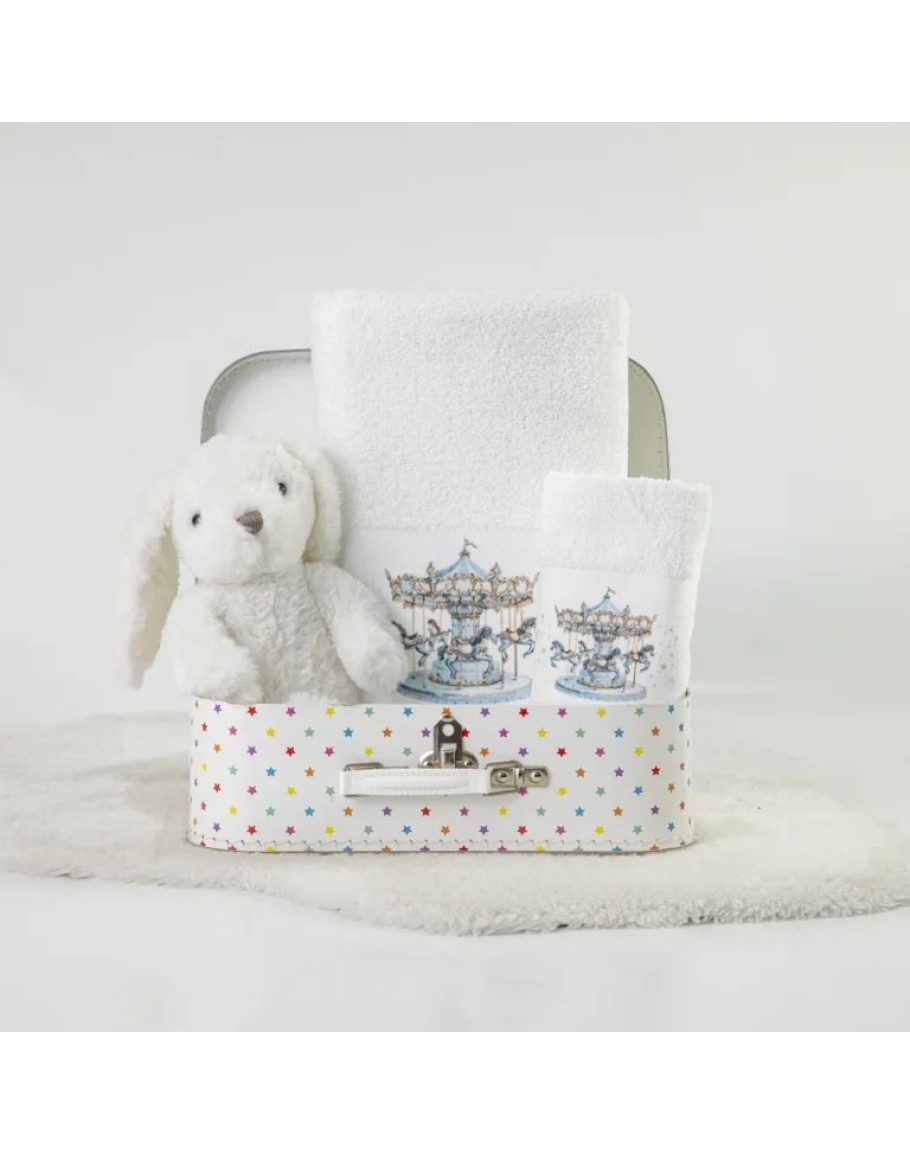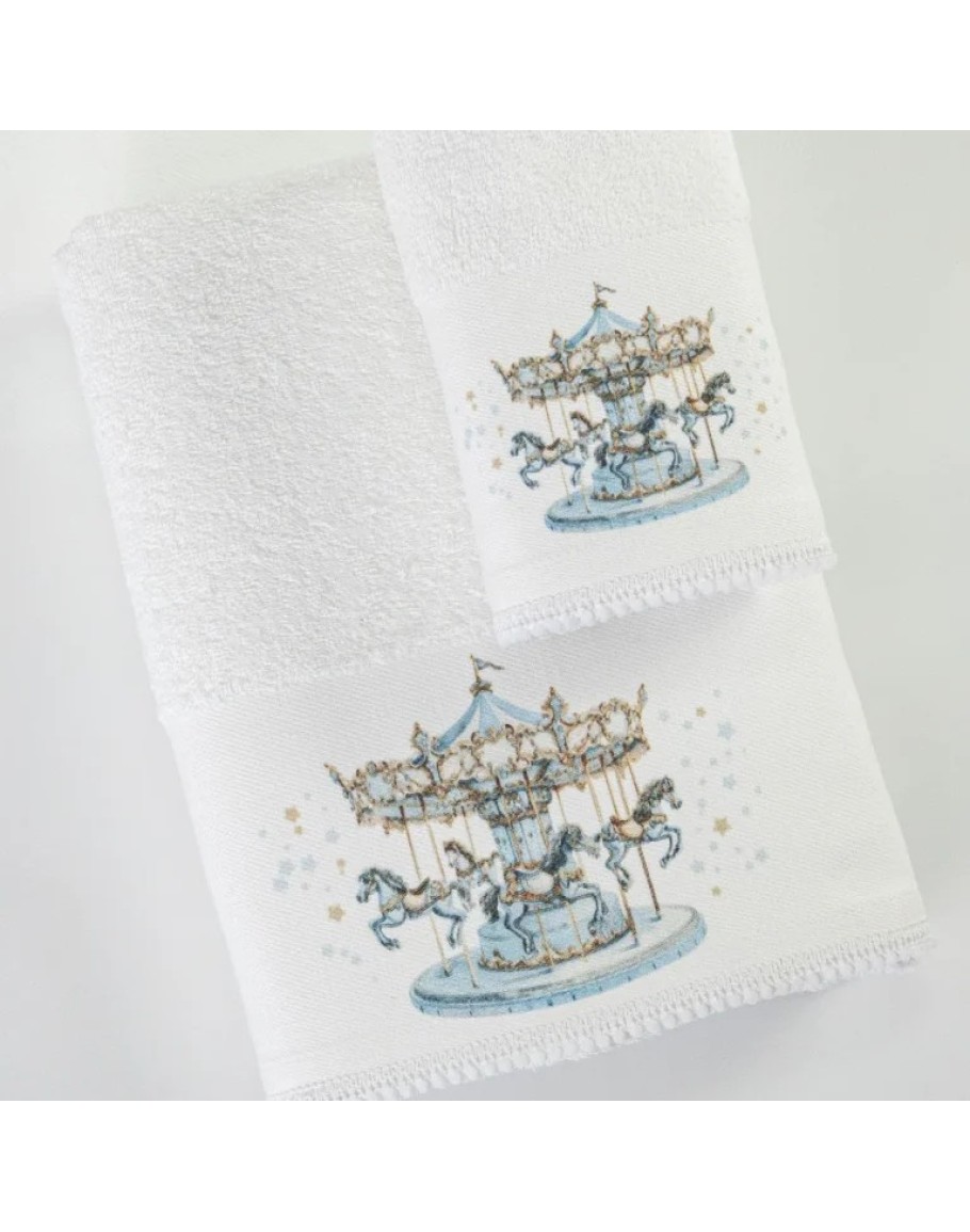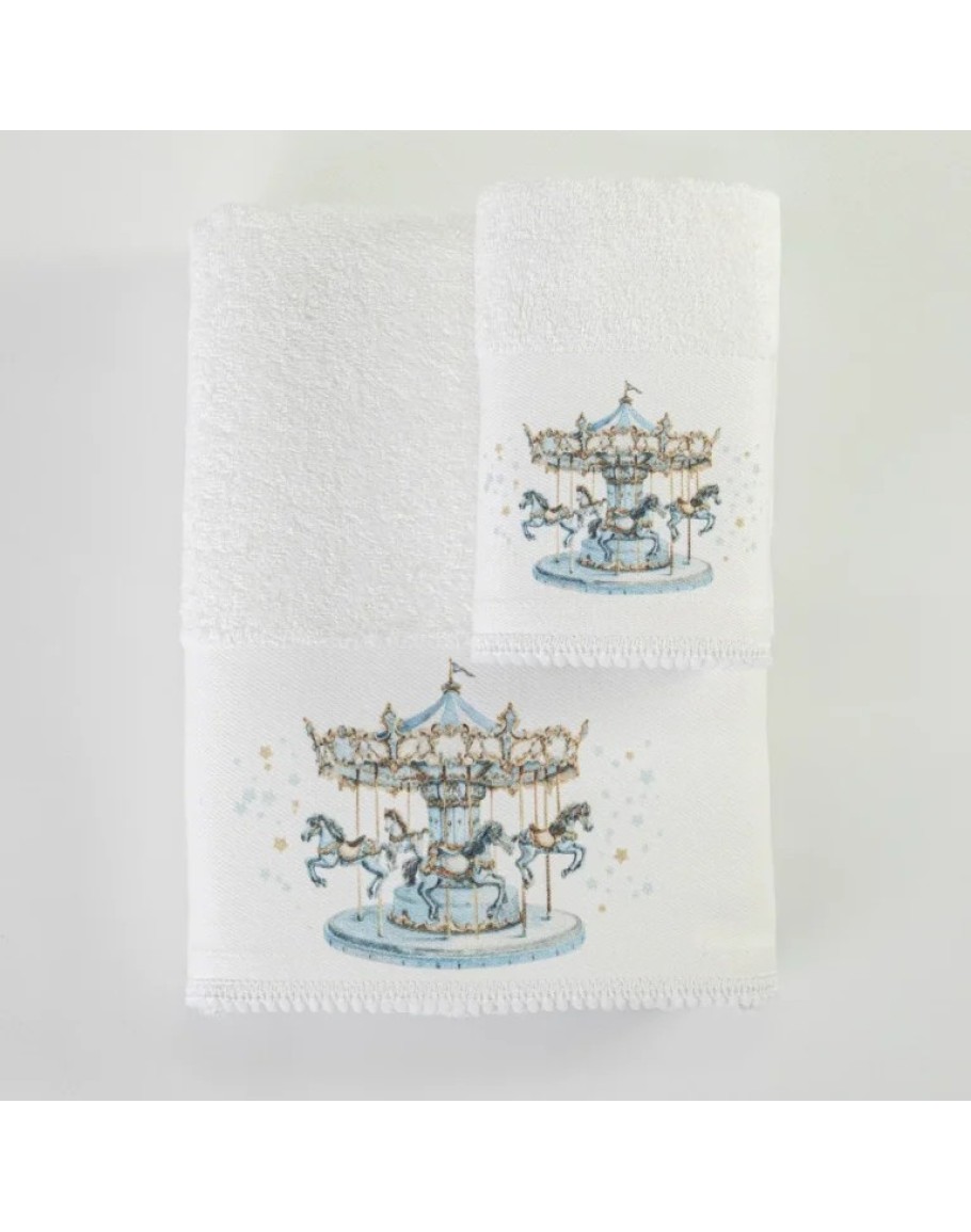 Σετ πετσέτες, Carousel, Λευκό-Σιέλ, Borea, 2 τεμαχίων, μπάνιου και χειρός, από ύφασμα φροτέ πενιέ, 100% βαμβακερό, μονόχρωμο, λευκό, με ψηφιακή εκτύπωση σε χρώμα σιέλ και δαντέλα, σχέδιο καρουζέλ.