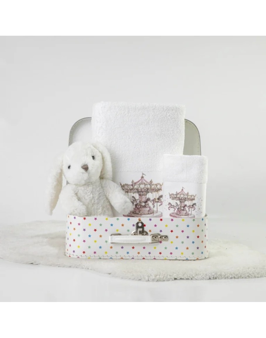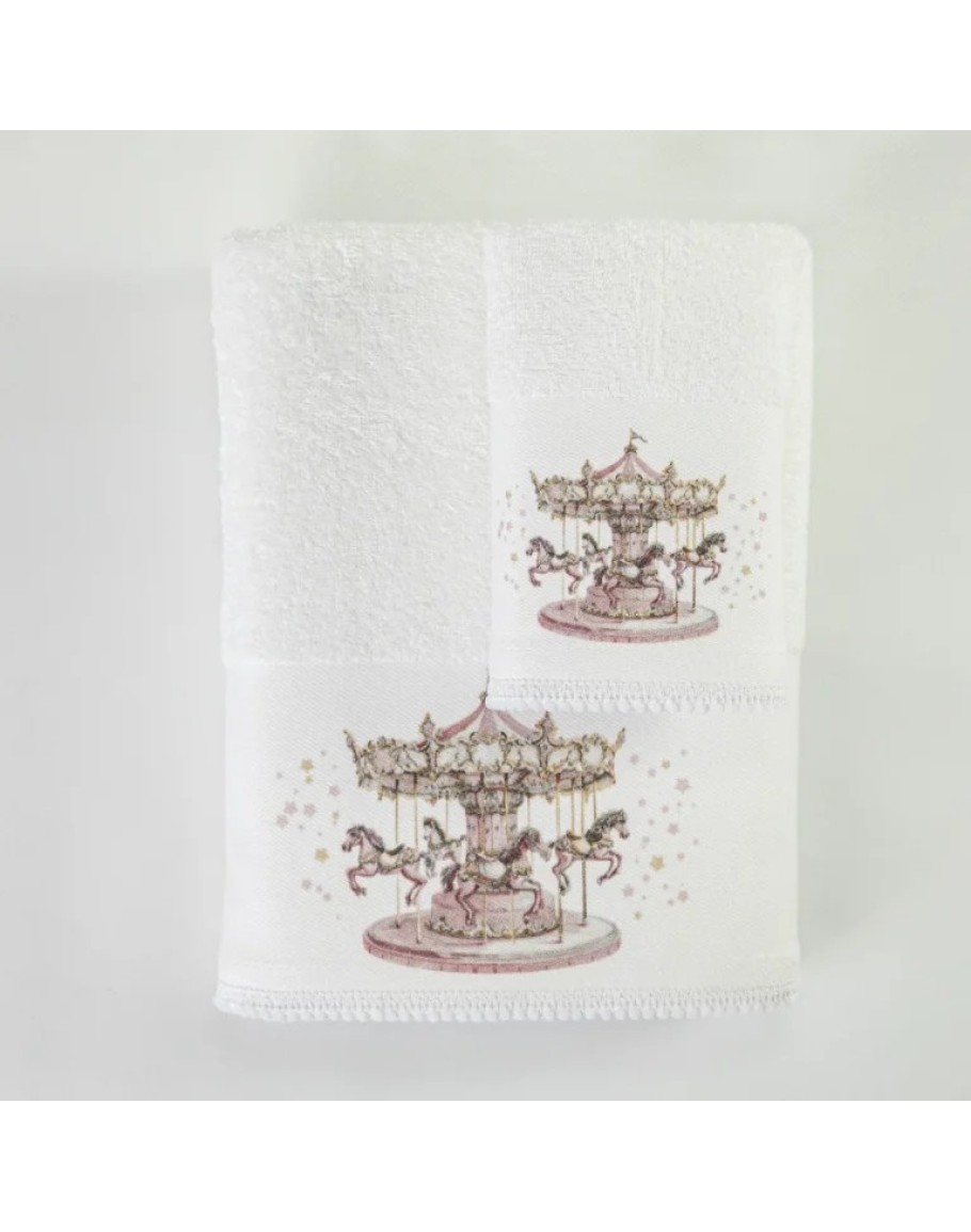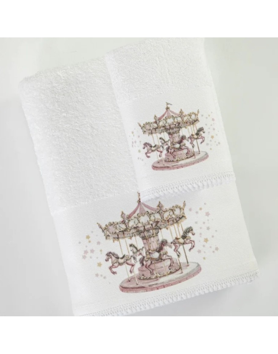 Σετ πετσέτες, Carousel, Λευκό-Ροζ, Borea, 2 τεμαχίων, μπάνιου και χειρός, από ύφασμα φροτέ πενιέ, 100% βαμβακερό, μονόχρωμο, λευκό, με ψηφιακή εκτύπωση σε χρώμα ροζ και δαντέλα, σχέδιο καρουζέλ.