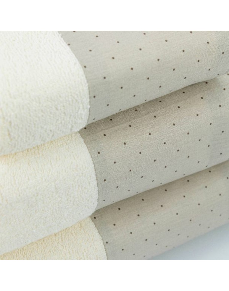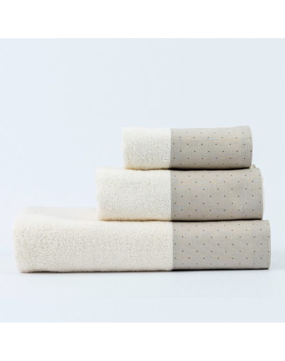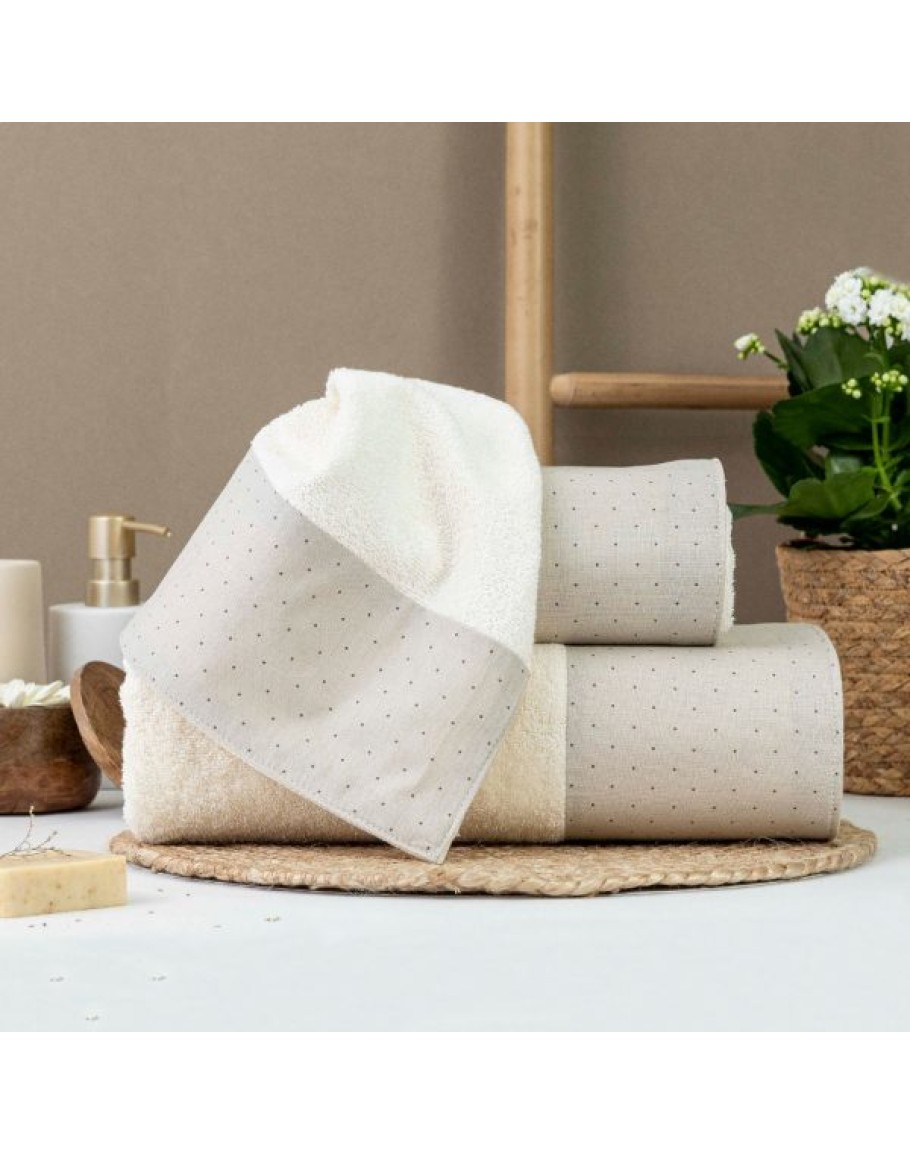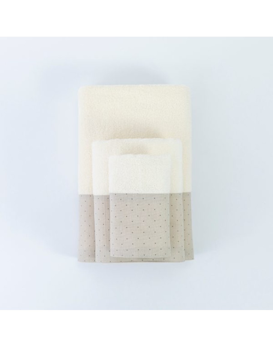 Σετ Πετσέτες 3 τεμαχίων, Pois, Borea, μπάνιου, προσώπου και χειρός, από ύφασμα φροτέ, πενιέ, 100% βαμβακερό, με διακοσμητική φάσα ύφασμα, χρώμα εκρού. Διαστάσεις: 70x140 / 50x90 / 30x50εκ.