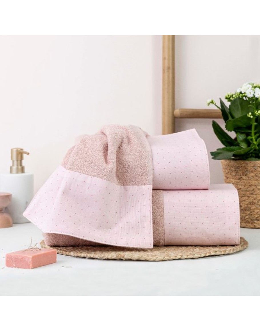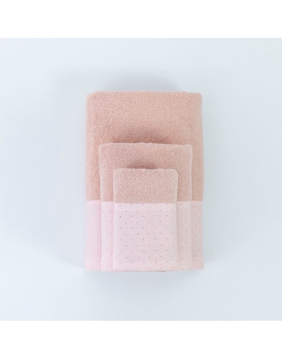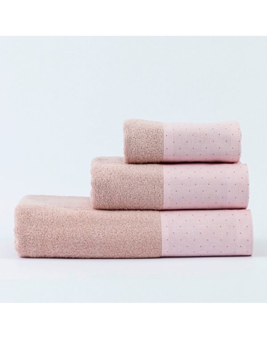 Σετ Πετσέτες 3 τεμαχίων, Pois, Borea, μπάνιου, προσώπου και χειρός, από ύφασμα φροτέ, πενιέ, 100% βαμβακερό, με διακοσμητική φάσα ύφασμα, χρώμα πούδρα. Διαστάσεις: 70x140 / 50x90 / 30x50εκ.