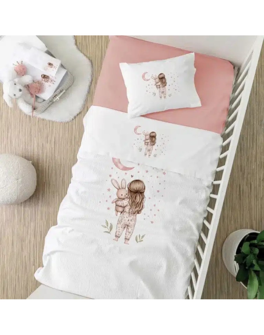 Σετ σεντόνια κούνιας ροζέ, Goodnight, Borea, από ύφασμα μερσεριζέ, 160 κλωστών, 100% βαμβακερό, μονόχρωμο, σε χρώμα λευκό, με ψηφιακή εκτύπωση στο πανωσέντονο και στη μαξιλαροθήκη, σχέδιο με παιδάκια με βρεφικές πιτζάμες. Το σετ περιλαμβάνει 1 πανωσέντονο 120Χ160εκ, 1 κατωσέντονο 120Χ160εκ και 1 μαξιλαροθήκη 30Χ40εκ.