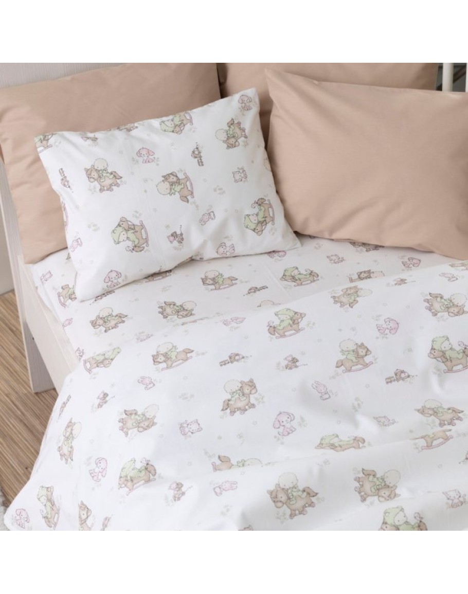 Σετ σεντόνια κούνιας, Rocking Horse Βεραμάν, Borea, από ύφασμα μερσεριζέ, 160 κλωστών, 100% βαμβακερό, εμπριμέ, σε λευκό φόντο, χρώμα βεραμάν, σχέδιο κουνιστό αλογάκι. Το σετ περιλαμβάνει 1 πανωσέντονο 120Χ160εκ, 1 κατωσέντονο 120Χ160εκ και 1 μαξιλαροθήκη 30Χ40εκ.