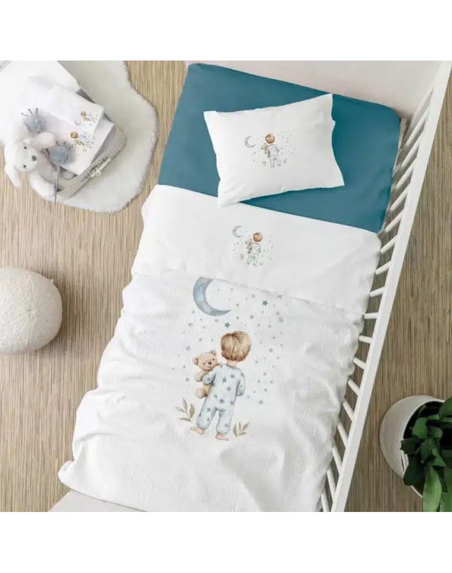 Σετ σεντόνια κούνιας πετρόλ, Goodnight, Borea, από ύφασμα μερσεριζέ, 160 κλωστών, 100% βαμβακερό, μονόχρωμο, σε χρώμα λευκό, με ψηφιακή εκτύπωση στο πανωσέντονο και στη μαξιλαροθήκη, σχέδιο με παιδάκια με βρεφικές πιτζάμες. Το σετ περιλαμβάνει 1 πανωσέντονο 120Χ160εκ, 1 κατωσέντονο 120Χ160εκ και 1 μαξιλαροθήκη 30Χ40εκ.