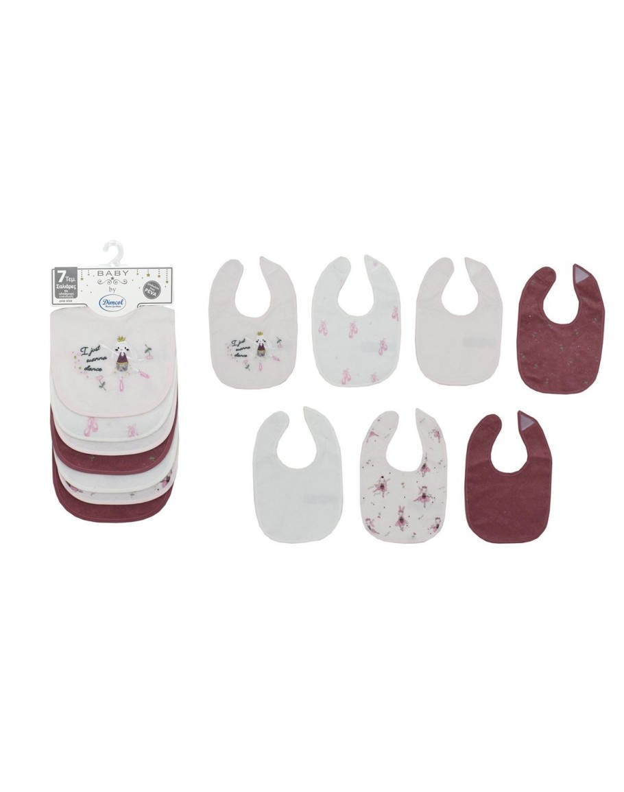 Σετ 7 τεμαχίων αδιάβροχες σαλιάρες, Ballerina 07, Dimcol, με διαστάσεις 30Χ20εκ και velcro. Οι σαλιάρες είνια κατασκευασμένες από CVC Terry ύφασμα 60% βαμβάκι - 40% πολυέστερ πολύ απαλό στην επάνω όψη και αδιάβροχο PEVA χωρίς φθαλικές ενώσεις στην κάτω όψη και είναι ελεγμένες για επιβλαβείς ουσίες (πιστοποιητικό OEKO-TEX standard 100).