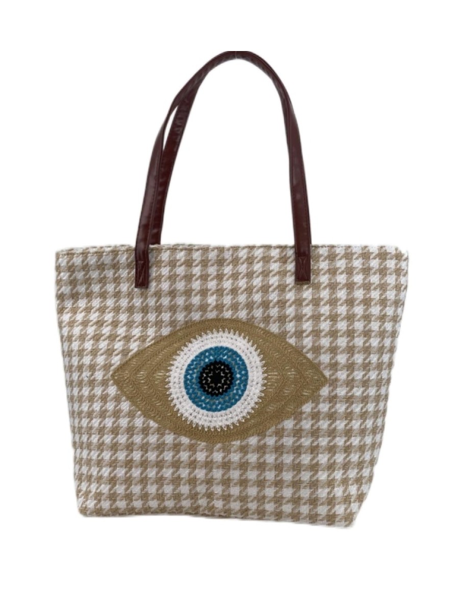 Τσάντα, 565010L, μπεζ, Ilis home, με κέντημα αλυσιδοβελονιά, με φερμουάρ, εσωτερικό τσεπάκι και λουράκια από δερματίνη, ιδανική για τη θάλασσα ή την πόλη. Διάσταση: 52Χ40Χ13εκ