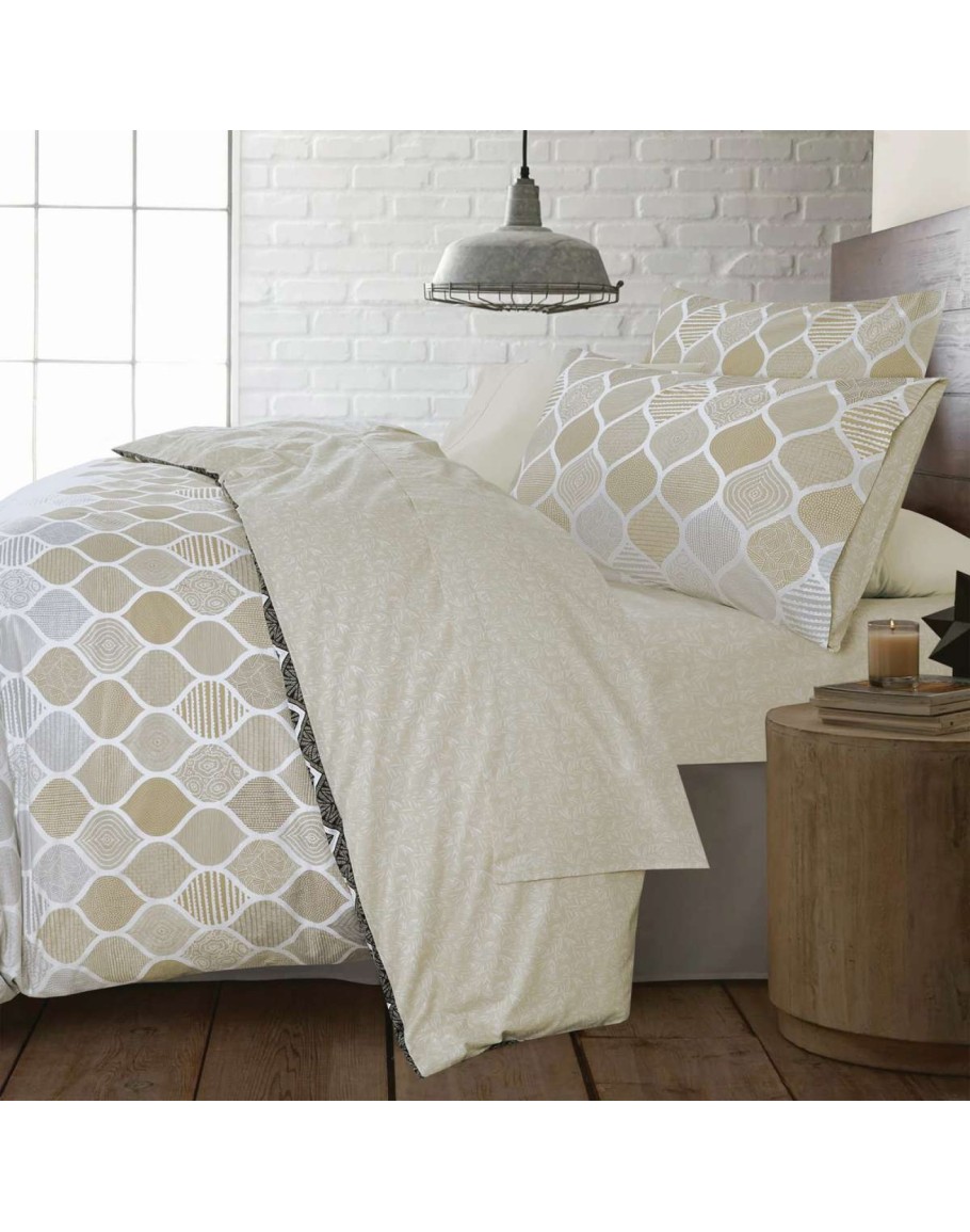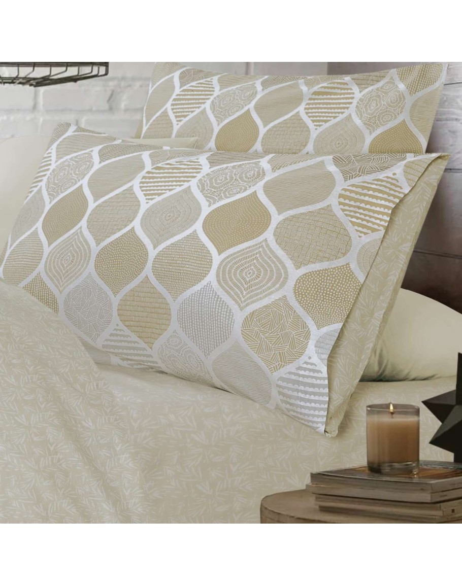 Σετ υπέρδιπλα σεντόνια σε αποχρώσεις του μπεζ και του γκρι, διακοσμημένο με υπέροχο γεωμετρικό σχέδιο από την εταιρεία ESPREE. Η σύνθεσή του είναι από 100% βαμβάκι με πυκνότητα ύφανσης 144 κλωστών. Διαθέτει ειδική επεξεργασία που το καθιστά εύκολο στο σιδέρωμα, εξασφαλίζοντας απόλυτη απαλότητα στην υφή και ανθεκτικότητα στο πέρασμα του χρόνου. Το σετ περιλαμβάνει ένα κατωσέντονο με λάστιχο σε διάσταση 160x200+35εκ, ένα πανωσέντονο σε διάσταση 240x270εκ και δύο μαξιλαροθήκες 52x72εκ, δημιουργώντας ένα ολοκληρωμένο και κομψό σύνολο που θα αναβαθμίσει την αισθητική του υπνοδωματίου σας. Πλένεται στους 40°C.