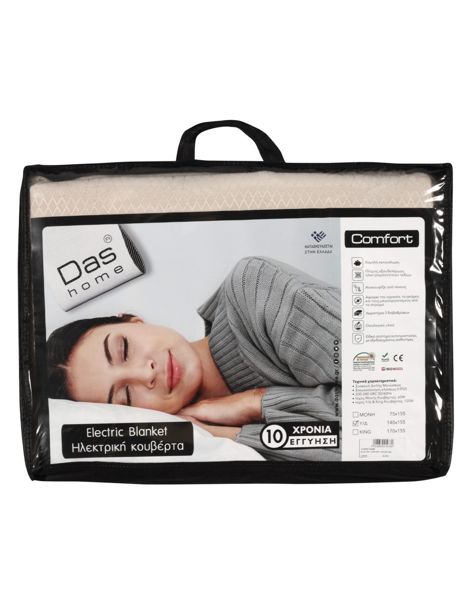 Das home ηλεκτρική κουβέρτα νέας τεχνολογίας με αυτόματο έλεγχο υπερθέρμανσης για προστασία. Διαθέτει χειριστήριο 3 διαβαθμίσεων για τη ρύθμιση της θερμοκρασίας. Η πάνω πλευρά της ηλεκτρικής κουβέρτας είναι 100% οικολογικό βαμβάκι και η κάτω πλευρά απο 100% polyester. Κατασκευάζεται στην Ελλάδα σε διάσταση 140Χ155cm. Das home...makes your house a home!
